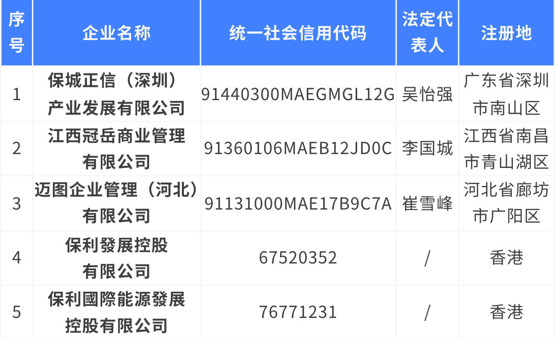 经保利集团核实,下表所列公司及其下设各级子公司均与保利集团及所属公司无任何隶属与股权关系,也不存在任何投资、合作、业务等关系,其一切行为均与保利集团无关。请广大社会公众提高警惕,注意防范风险,如发现其违法犯罪行为,请尽快到公安机关报案。